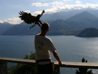 Al centro del Lago di Como, sul promontorio che sovrasta Varenna, si erge, da più di mille anni, il Castello di Vezio, un antico avamposto militare di origine basso medioevale eretto a difesa e controllo del lago e dei borghi circostanti dalla regina longobarda Teodolinda. Situato in un luogo militarmente e commercialmente strategico da cui si domina l’intero centro Lago di Como e per questo abitato sin dall’età del ferro, il Castello era associato in passato al borgo di Varenna e collegato ad esso da due lunghe braccia di mura che la cingevano fino al lago, proteggendo il paese e i suoi abitanti nelle frequenti guerre e saccheggi che sconvolsero il territorio durante tutto il medioevo. Parzialmente restaurato nella metà del XX secolo, oggi il Castello si presenta con una torre di avvistamento a base quadrata, accessibile tramite un piccolo ponte levatoio e visitabile fin sulla sommità, circondata da una prima cinta muraria quadrangolare con una parziale torretta angolare. Immerso nel verde di uno degli oliveti più a nord del mondo, grazie all’effetto di termoregolazione delle acque del Lago, il Castello, aperto e visitabile da marzo a novembre, ospita occasionalmente esposizioni di opere d’arte di vari generi nel giardino e permanentemente, all’interno della torre, un’esposizione sul Lariosauro, rettile marino preistorico venuto alla luce per la prima volta al mondo a poche centinaia di metri dal Castello. Con i suoi sotterranei parzialmente visitabili, le statue disseminate nel giardino, i “fantasmi” e i rapaci del nostro piccolo centro di falconeria, il castello si fonde, in un contesto di ineguagliabile bellezza naturale, con l’arte, la storia e la cultura del territorio e speriamo possa regalarvi una piacevole pausa di relax e armonia a contatto con la natura.