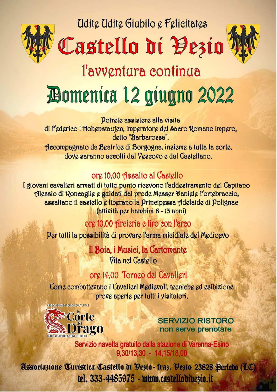 Servizio navetta gratuito dalla stazione di Varenna-Esino-Perledo. Attività per adulti e bambini, tiro con l'arco, giochi medioevali, vita nel castello con dame cavalieri boia e cartomante.